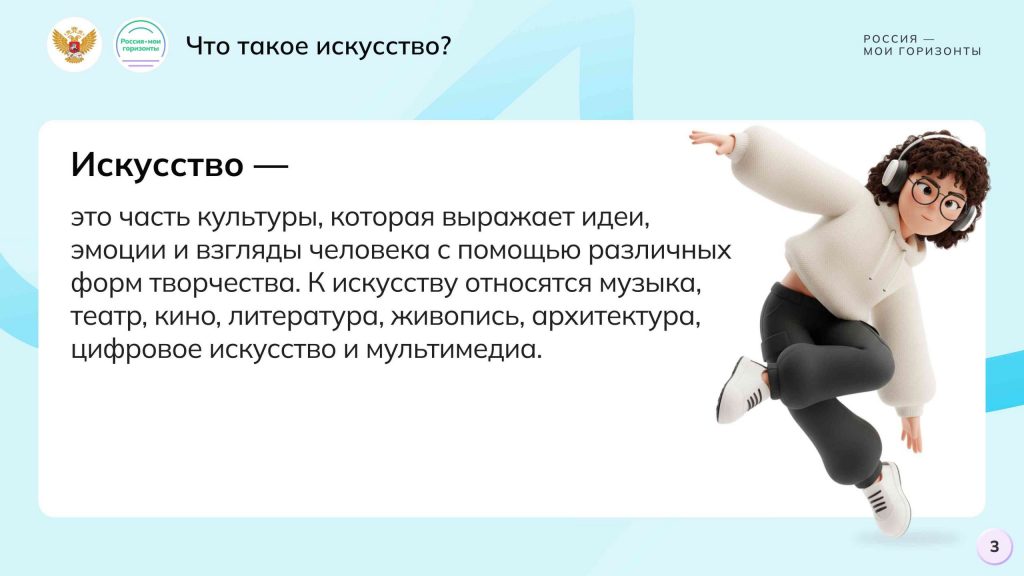 Искусство — это часть культуры, которая выражает идеи, эмоции и взгляды человека с помощью различных форм творчества. К искусству относятся музыка, театр, кино, литература, живопись, архитектура, цифровое искусство и мультимедиа.