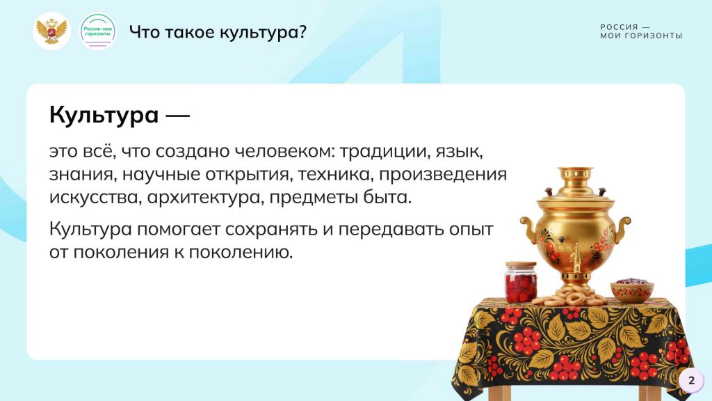 Культура формирует то, как мы живём, как общаемся, как думаем и как воспринимаем мир. Она объединяет людей, помогает сохранять традиции и одновременно создавать что-то новое. Без культуры невозможно представить ни историю страны, ни современную жизнь.
