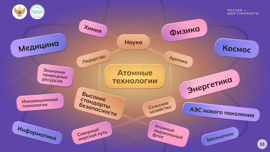 А именно, об атомной отрасли, которая использует ядерную силу — самую мощную силу природы. Предприятия и организации, которые используют ядерные технологии, составляют атомную промышленность России, и в этом году ей исполнилось 80 лет! Именно российские учёные первыми поняли, как направить ядерную силу на пользу человечества. Именно в нашей стране была построена первая в мире атомная электростанция, что дало всему миру новую технологию производства чистой энергии. Теперь, благодаря нашим открытиям, вся планета пользуется преимуществами атомной энергетики, а Россия продолжает оставаться мировым лидером в этой отрасли.