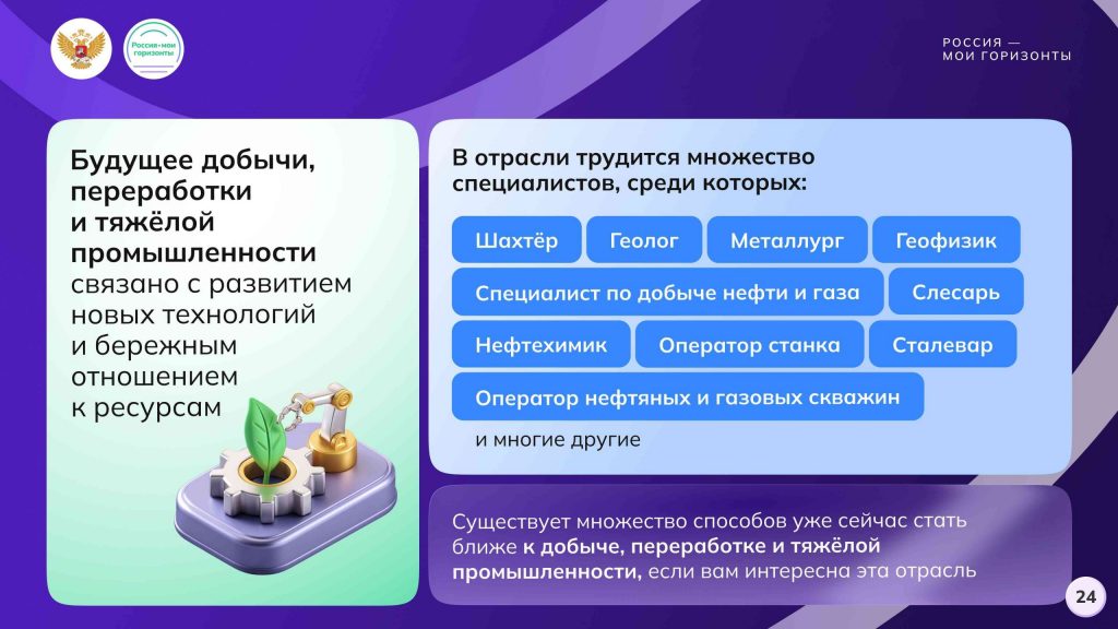 Сегодня на занятии мы познакомились с современными технологиями, которые помогают добывать и перерабатывать ресурсы, а также узнали, как развивается эта отрасль и какие перед ней стоят задачи.