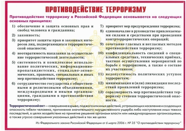 Угроза совершения теракта сегодня существует практически для каждого жителя планеты, абсолютной гарантии безопасности нет ни для кого. Тем не менее, общество обязано предпринимать всё возможное для обеспечения должного уровня защиты. Антитеррористическая защищённость образовательных учреждений приобретает особую значимость, поскольку от этого зависят жизни детей. Активно ведётся работа по созданию специального комплекса мер, направленных на антитеррористическую защищённость образовательного учреждения: укрепление материальной базы; стабильно действующая профилактическая работа, направленная на усиление внимания персонала образовательного учреждения к проблеме терроризма; формирование навыков оперативной и своевременной реакции на угрозу терроризма.